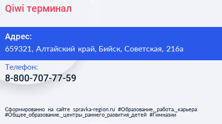 Qiwi, терминал по адресу 659321, Алтайский край, Бийск, Советская, 216а в дальнейшем Организация, размещена в следующих категориях: