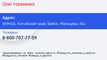 Qiwi, терминал по адресу 659616, Алтайский край, Бийск, Мальцева, 61а в дальнейшем Организация, размещена в следующих категориях: