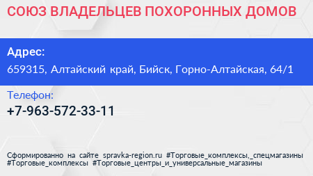 СОЮЗ ВЛАДЕЛЬЦЕВ ПОХОРОННЫХ ДОМОВ по адресу 659315, Алтайский край, Бийск, Горно-Алтайская, 64/1 в дальнейшем Организация, размещена в следующих категориях: