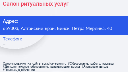 Салон ритуальных услуг по адресу 659303, Алтайский край, Бийск, Петра Мерлина, 40 в дальнейшем Организация, размещена в следующих категориях: