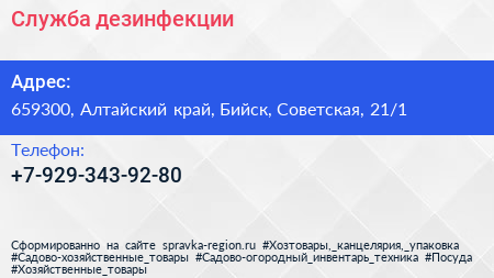 Служба дезинфекции по адресу 659300, Алтайский край, Бийск, Советская, 21/1 в дальнейшем Организация, размещена в следующих категориях: