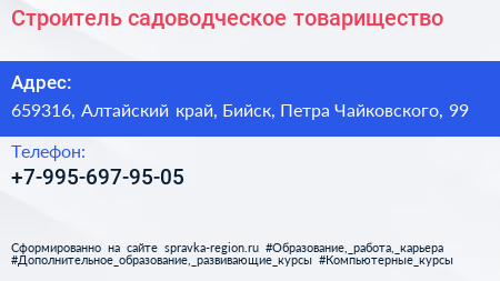 Строитель, садоводческое товарищество по адресу 659316, Алтайский край, Бийск, Петра Чайковского, 99 в дальнейшем Организация, размещена в следующих категориях: