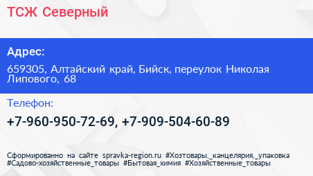 ТСЖ Северный по адресу 659305, Алтайский край, Бийск, переулок Николая Липового, 68 в дальнейшем Организация, размещена в следующих категориях: