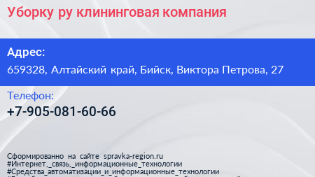Уборку.ру, клининговая компания по адресу 659328, Алтайский край, Бийск, Виктора Петрова, 27 в дальнейшем Организация, размещена в следующих категориях:
