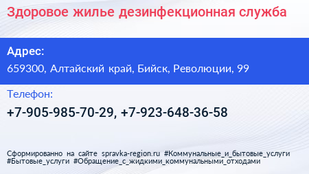 Здоровое жилье, дезинфекционная служба по адресу 659300, Алтайский край, Бийск, Революции, 99 в дальнейшем Организация, размещена в следующих категориях:
