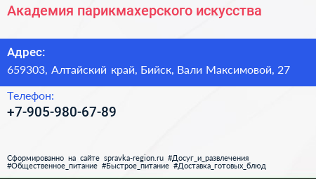 Академия парикмахерского искусства по адресу 659303, Алтайский край, Бийск, Вали Максимовой, 27 в дальнейшем Организация, размещена в следующих категориях: