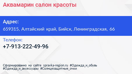 Аквамарин, салон красоты по адресу 659315, Алтайский край, Бийск, Ленинградская, 66 в дальнейшем Организация, размещена в следующих категориях:
