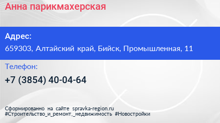 Анна, парикмахерская по адресу 659303, Алтайский край, Бийск, Промышленная, 11 в дальнейшем Организация, размещена в следующих категориях:
