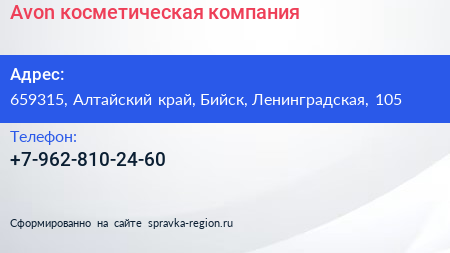 Avon, косметическая компания по адресу 659315, Алтайский край, Бийск, Ленинградская, 105 в дальнейшем Организация, размещена в следующих категориях: