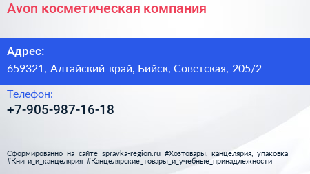 Avon, косметическая компания по адресу 659321, Алтайский край, Бийск, Советская, 205/2 в дальнейшем Организация, размещена в следующих категориях: