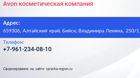 Avon, косметическая компания по адресу 659306, Алтайский край, Бийск, Владимира Ленина, 250/1 в дальнейшем Организация, размещена в следующих категориях: