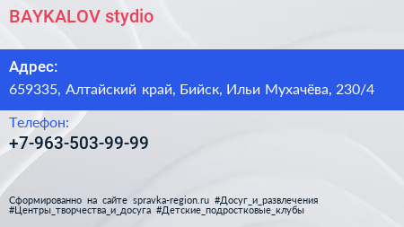 BAYKALOV stydio по адресу 659335, Алтайский край, Бийск, Ильи Мухачёва, 230/4 в дальнейшем Организация, размещена в следующих категориях: