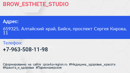 BROW_ESTHETE_STUDIO по адресу 659325, Алтайский край, Бийск, проспект Сергея Кирова, 11 в дальнейшем Организация, размещена в следующих категориях: