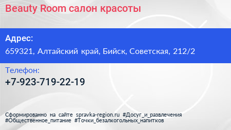 Beauty Room, салон красоты по адресу 659321, Алтайский край, Бийск, Советская, 212/2 в дальнейшем Организация, размещена в следующих категориях: