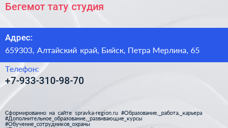 Бегемот, тату-студия по адресу 659303, Алтайский край, Бийск, Петра Мерлина, 65 в дальнейшем Организация, размещена в следующих категориях:
