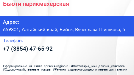 Бьюти, парикмахерская по адресу 659301, Алтайский край, Бийск, Вячеслава Шишкова, 5 в дальнейшем Организация, размещена в следующих категориях: