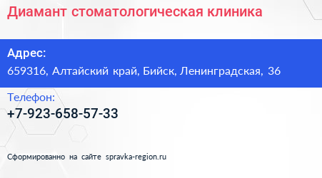 Диамант, стоматологическая клиника по адресу 659316, Алтайский край, Бийск, Ленинградская, 36 в дальнейшем Организация, размещена в следующих категориях: