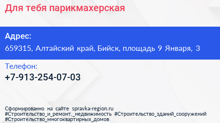 Для тебя, парикмахерская по адресу 659315, Алтайский край, Бийск, площадь 9 Января, 3 в дальнейшем Организация, размещена в следующих категориях: