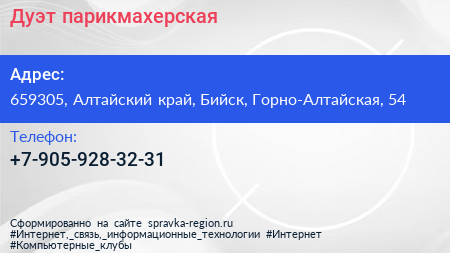Дуэт, парикмахерская по адресу 659305, Алтайский край, Бийск, Горно-Алтайская, 54 в дальнейшем Организация, размещена в следующих категориях: