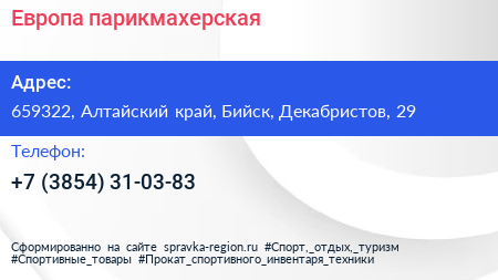 Европа, парикмахерская по адресу 659322, Алтайский край, Бийск, Декабристов, 29 в дальнейшем Организация, размещена в следующих категориях: