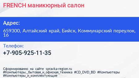 FRENCH, маникюрный салон по адресу 659300, Алтайский край, Бийск, Коммунарский переулок, 16 в дальнейшем Организация, размещена в следующих категориях: