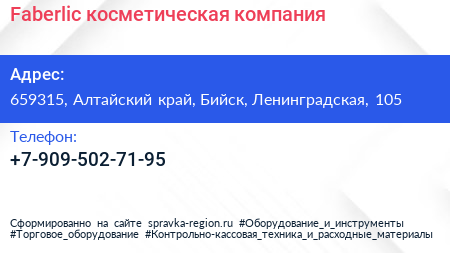 Faberlic, косметическая компания по адресу 659315, Алтайский край, Бийск, Ленинградская, 105 в дальнейшем Организация, размещена в следующих категориях: