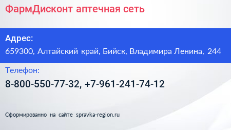 ФармДисконт, аптечная сеть по адресу 659300, Алтайский край, Бийск, Владимира Ленина, 244 в дальнейшем Организация, размещена в следующих категориях: