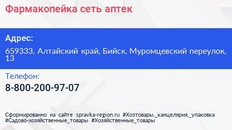 Фармакопейка, сеть аптек по адресу 659333, Алтайский край, Бийск, Муромцевский переулок, 13 в дальнейшем Организация, размещена в следующих категориях: