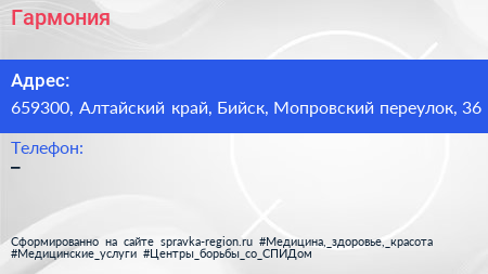 Гармония по адресу 659300, Алтайский край, Бийск, Мопровский переулок, 36 в дальнейшем Организация, размещена в следующих категориях: