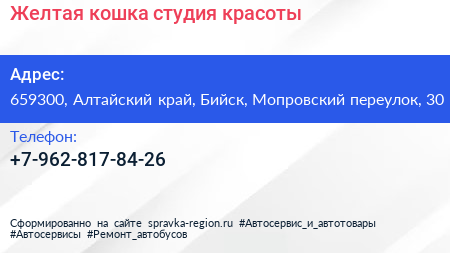 Желтая кошка, студия красоты по адресу 659300, Алтайский край, Бийск, Мопровский переулок, 30 в дальнейшем Организация, размещена в следующих категориях: