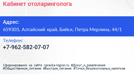 Кабинет отоларинголога по адресу 659303, Алтайский край, Бийск, Петра Мерлина, 44/1 в дальнейшем Организация, размещена в следующих категориях: