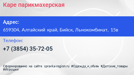 Каре, парикмахерская по адресу 659304, Алтайский край, Бийск, Льнокомбинат, 15в в дальнейшем Организация, размещена в следующих категориях: