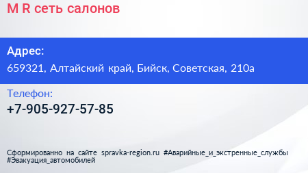 M.R., сеть салонов по адресу 659321, Алтайский край, Бийск, Советская, 210а в дальнейшем Организация, размещена в следующих категориях: