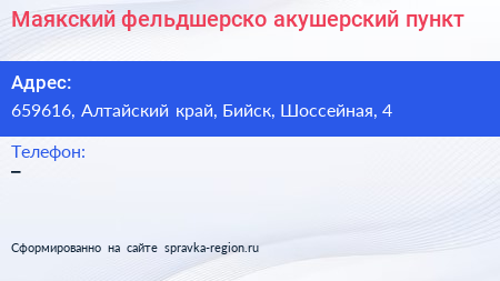 Маякский фельдшерско-акушерский пункт по адресу 659616, Алтайский край, Бийск, Шоссейная, 4 в дальнейшем Организация, размещена в следующих категориях: