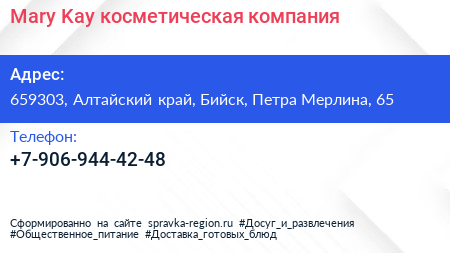 Mary Kay, косметическая компания по адресу 659303, Алтайский край, Бийск, Петра Мерлина, 65 в дальнейшем Организация, размещена в следующих категориях: