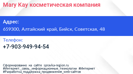 Mary Kay, косметическая компания по адресу 659300, Алтайский край, Бийск, Советская, 48 в дальнейшем Организация, размещена в следующих категориях: