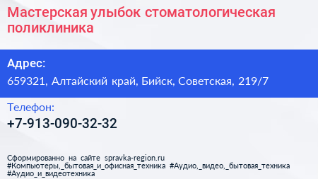 Мастерская улыбок, стоматологическая поликлиника по адресу 659321, Алтайский край, Бийск, Советская, 219/7 в дальнейшем Организация, размещена в следующих категориях: