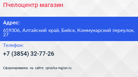 Пчелоцентр, магазин по адресу 659306, Алтайский край, Бийск, Коммунарский переулок, 27 в дальнейшем Организация, размещена в следующих категориях: