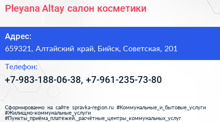Pleyana-Altay, салон косметики по адресу 659321, Алтайский край, Бийск, Советская, 201 в дальнейшем Организация, размещена в следующих категориях: