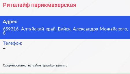 Риталайф, парикмахерская по адресу 659316, Алтайский край, Бийск, Александра Можайского, 8 в дальнейшем Организация, размещена в следующих категориях: