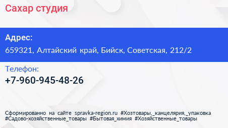 Сахар, студия по адресу 659321, Алтайский край, Бийск, Советская, 212/2 в дальнейшем Организация, размещена в следующих категориях: