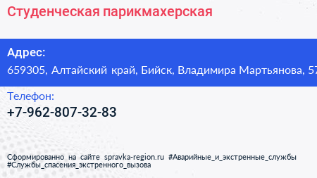 Студенческая, парикмахерская по адресу 659305, Алтайский край, Бийск, Владимира Мартьянова, 57 в дальнейшем Организация, размещена в следующих категориях: