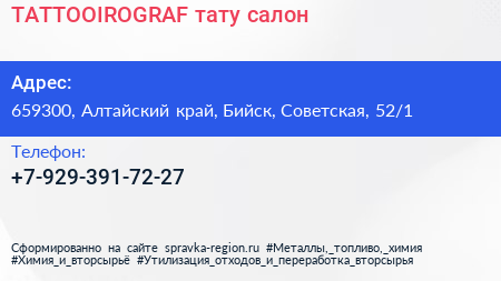 TATTOOIROGRAF, тату-салон по адресу 659300, Алтайский край, Бийск, Советская, 52/1 в дальнейшем Организация, размещена в следующих категориях: