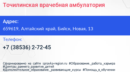 Точилинская врачебная амбулатория по адресу 659619, Алтайский край, Бийск, Новая, 13 в дальнейшем Организация, размещена в следующих категориях: