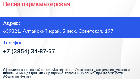 Весна, парикмахерская по адресу 659321, Алтайский край, Бийск, Советская, 197 в дальнейшем Организация, размещена в следующих категориях: