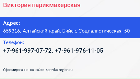 Виктория, парикмахерская по адресу 659316, Алтайский край, Бийск, Социалистическая, 50 в дальнейшем Организация, размещена в следующих категориях:
