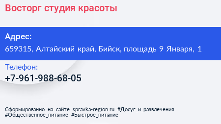 Восторг, студия красоты по адресу 659315, Алтайский край, Бийск, площадь 9 Января, 1 в дальнейшем Организация, размещена в следующих категориях: