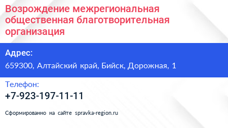 Возрождение, межрегиональная общественная благотворительная организация по адресу 659300, Алтайский край, Бийск, Дорожная, 1 в дальнейшем Организация, размещена в следующих категориях: