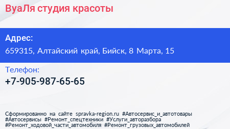 ВуаЛя, студия красоты по адресу 659315, Алтайский край, Бийск, 8 Марта, 15 в дальнейшем Организация, размещена в следующих категориях: