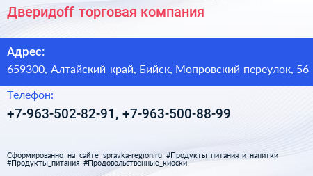 Дверидоff, торговая компания по адресу 659300, Алтайский край, Бийск, Мопровский переулок, 56 в дальнейшем Организация, размещена в следующих категориях:
